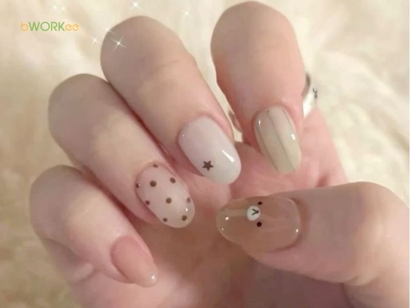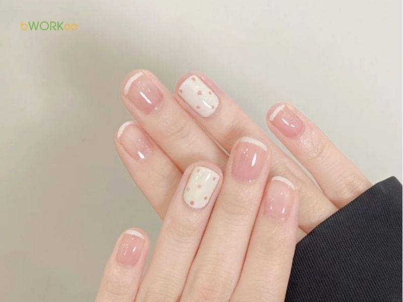 Sự kết hợp giữa màu nude hoặc be nhạt cùng các họa tiết như một chấm màu, một đường lượn sóng mảnh, hoặc họa tiết kẻ Line sẽ mang lại vẻ ngoài nail Hàn Quốc đơn giản mà sang. Phong cách này đặc biệt lý tưởng cho môi trường công sở hoặc mẫu nail Hàn Quốc cho móng ngắn.