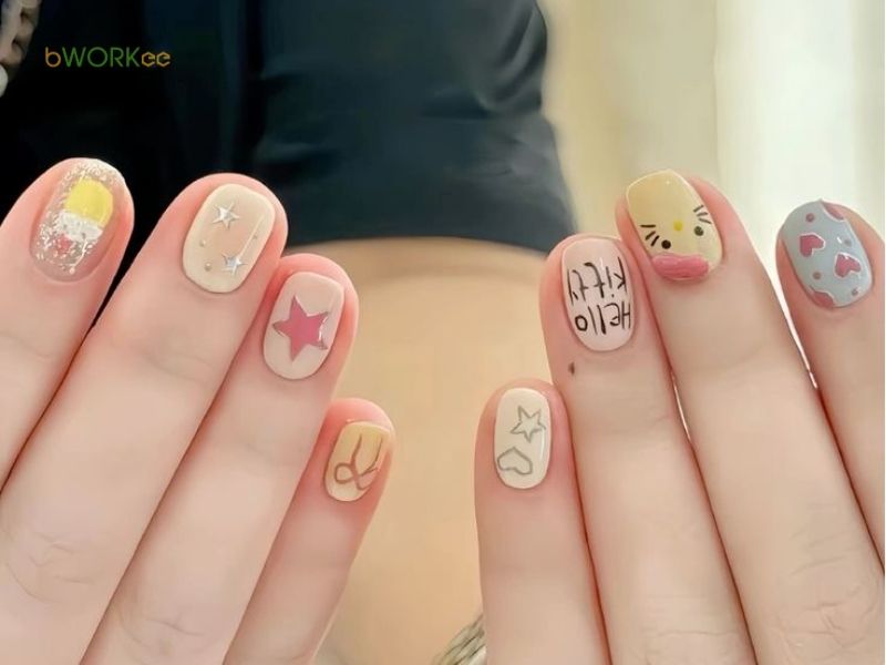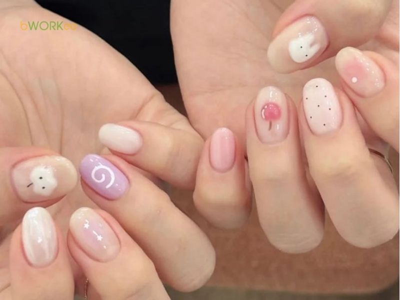 Sử dụng mẫu nail Hàn Quốc màu pastel như hồng phấn, xanh mint, tím lavender. Kết hợp thêm họa tiết trái tim nhỏ, đám mây trắng hoặc hình động vật ngộ nghĩnh, đây chính là nail Hàn Quốc dễ thương cho học sinh và các cô nàng yêu thích sự ngọt ngào.