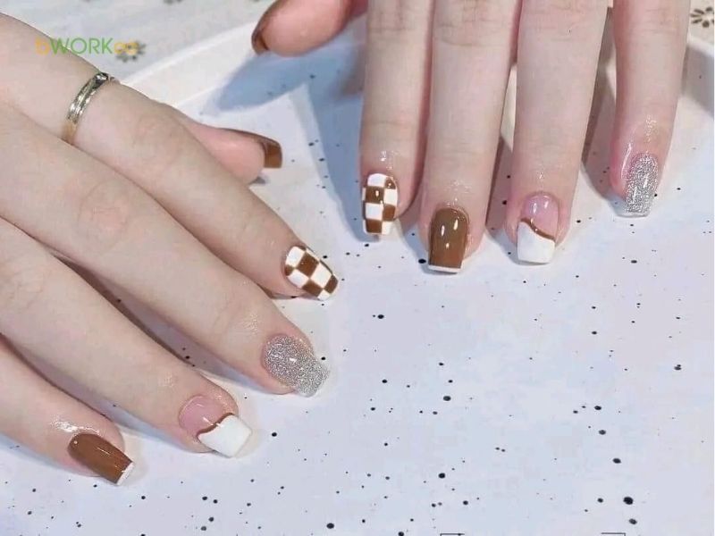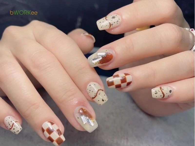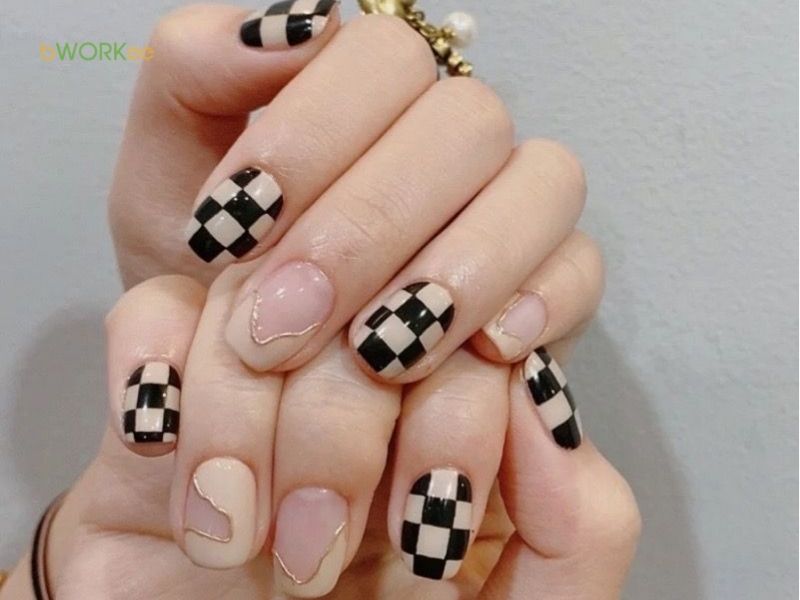 Kẻ caro, đặc biệt là tông màu nâu be hoặc trắng đen, mang lại vẻ ngoài Vintage và cá tính. Bạn có thể tham khảo app mẫu nail Hàn Quốc để tìm kiếm thêm các biến thể kẻ caro mới.