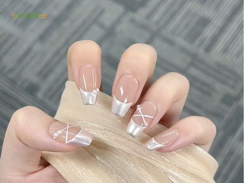 Thay vì sử dụng các chi tiết đính đá lớn, xu hướng mới hướng đến những đường viền ánh kim mảnh (gold hoặc silver) để định hình dáng móng tinh tế. Đây là kiểu móng tay Hàn Quốc mang nét hiện đại và tối giản – vừa sang trọng, vừa dễ kết hợp với nhiều phong cách khác nhau.