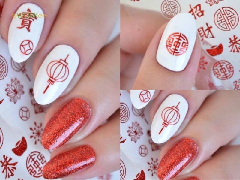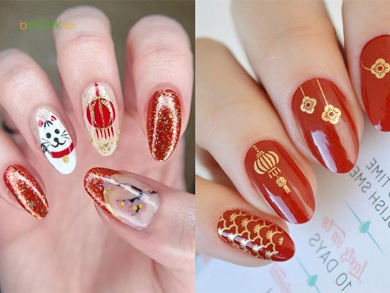 Đèn lồng là linh hồn của đêm hội Trăng Rằm. Mẫu nail này thường là sự kết hợp giữa tone đỏ và vàng ánh kim, tượng trưng cho tài lộc và may mắn.