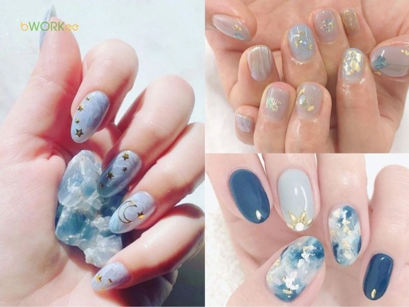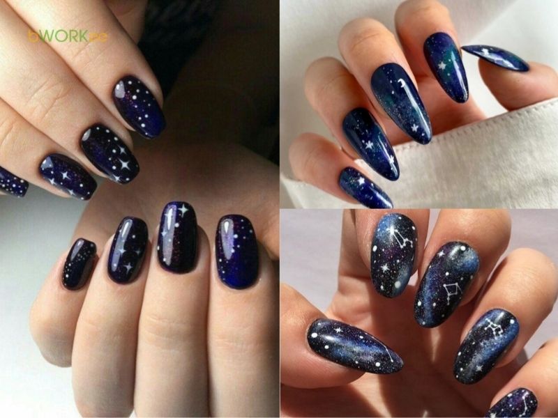 Dùng màu xanh dương đậm (navy) và kết hợp nhũ bạc để làm nổi bật sự huyền ảo của bầu trời đêm, tạo vẻ ngoài cá tính, khác biệt.