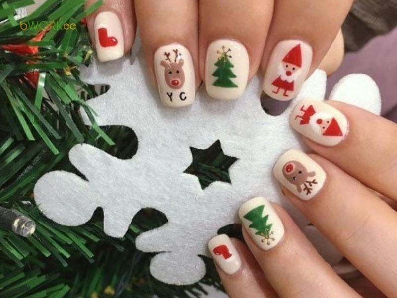 Các họa tiết này thể hiện sự Nail Noel Cute tuyệt đối. Mẫu nail ông già Noel thường được vẽ chi tiết khuôn mặt hoặc chiếc mũ đỏ trên nền móng cái, tạo điểm nhấn vui tươi và đáng yêu. Bạn cũng có thể chọn hình ảnh tuần lộc hoặc cây thông mini để Vẽ móng Noel cực kỳ sinh động.